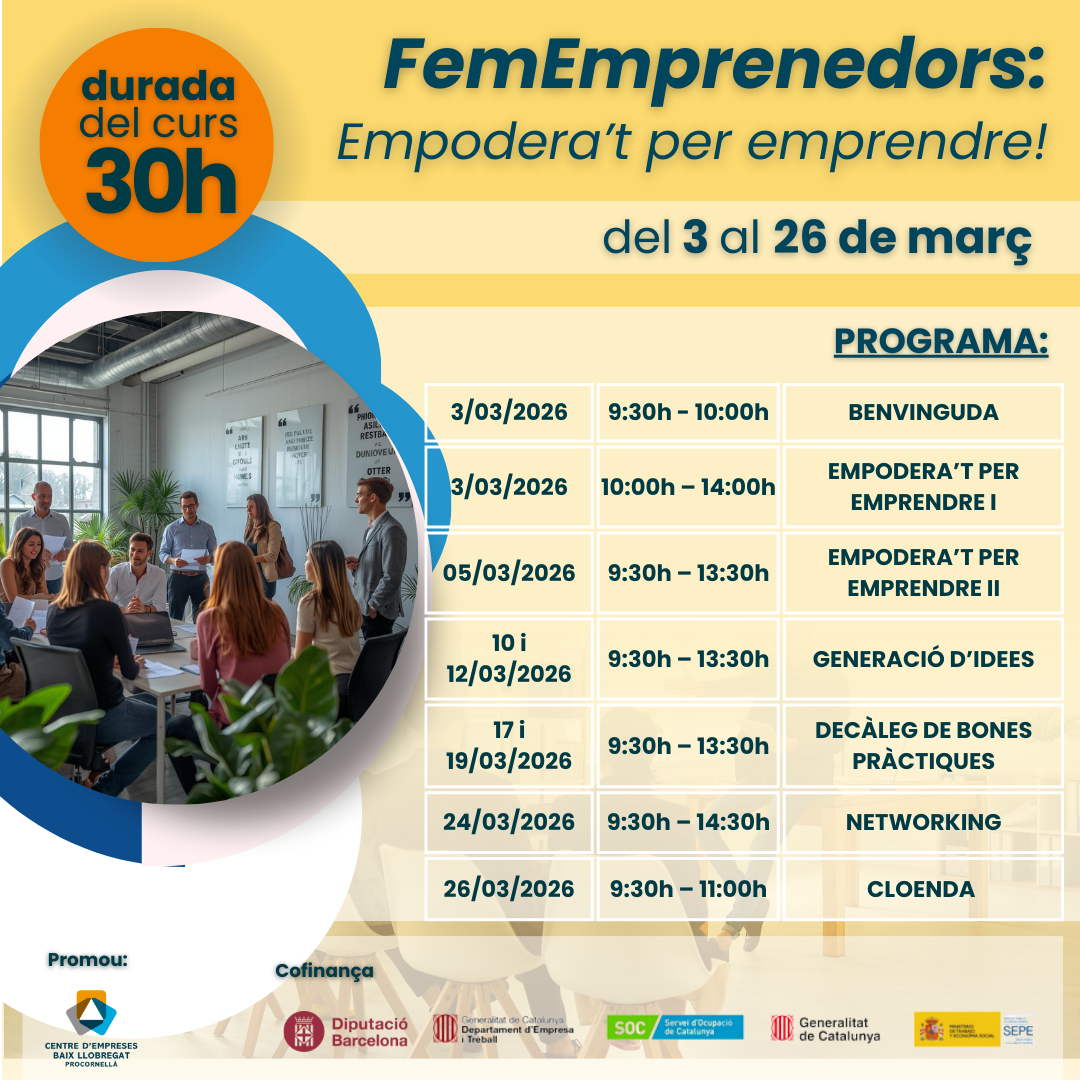 | 05/03/2026 | 9:30h – 13:30h | EMPODERA’T PER EMPRENDRE (2a part) |